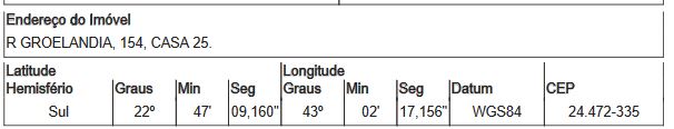 Localização: Casa em Endereço: RUA GROELANDIA | Bairro: FAZENDA DOS MINEIROS | Número: N. 154 CASA 25 SAO GONCALO - RJ