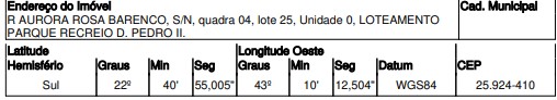 . RUA AURORA ROSA BARENCO,N. S/N QD 04, LT 25, PARQUE RECREIO DOM PEDRO II (GUIA D - CEP: 25924-410, MAGE - RIO DE JANEIRO