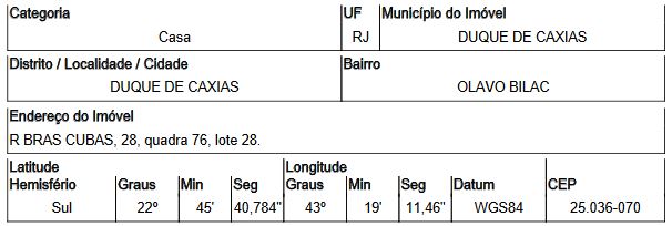 Localização: Casa em Endereço: RUA BRAS CUBAS | Bairro: OLAVO BILAC | Número: N. 28 LT 28 DUQUE DE CAXIAS - RJ